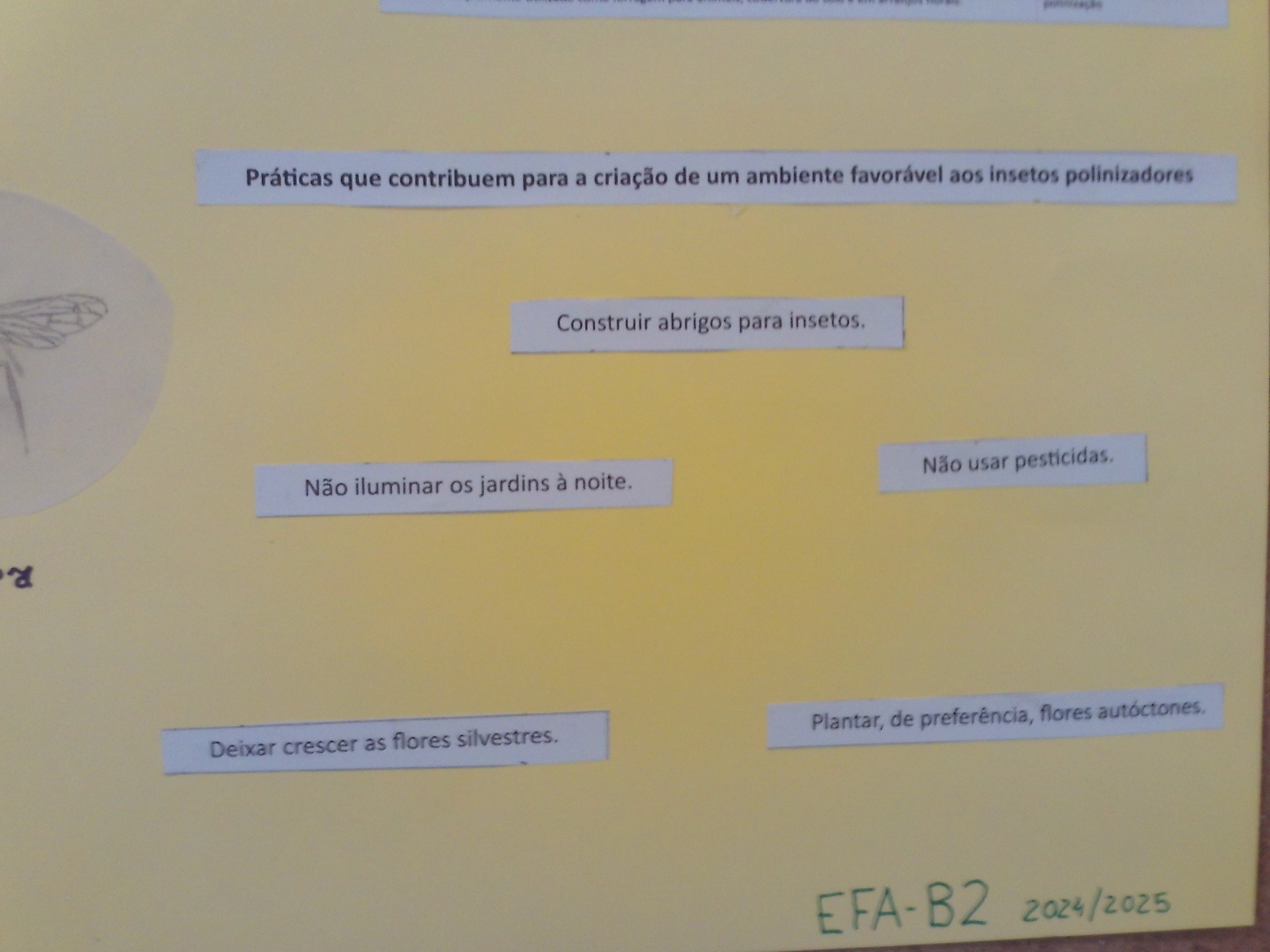 Na aula foi desenvolvida uma atividade sobre a polinização e a sua importância. Foram exploradas caraterísticas de várias plantas que atraem os insetos polinizadores: aroma, flores, folhas, propriedades medicinais, usos e o crescimento. Por fim, os formandos nomearam práticas que contribuem para a criação de um ambiente favorável aos insetos.