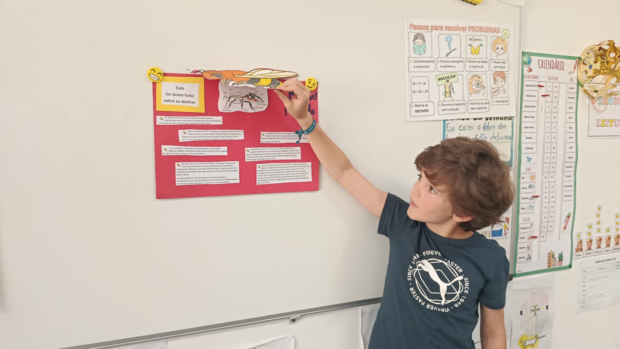 Os materiais apresentados na exposição foram construídos de duas formas: o 1.º ano em contexto de sala de aula com apoio da professora titular e professora de apoio socioeducativo. Utilizaram papel de cenário, marcadores, rolos de papel higiénico e para algumas situações recorreram a livros ou ao computador para compreender melhor a anatomia das abelhas. O 3.º ano apresentou trabalhos sobre as abelhas que surgiram de forma de trabalhos projeto, em que os alunos autonomamente pesquisaram e compilaram as informações encontradas.