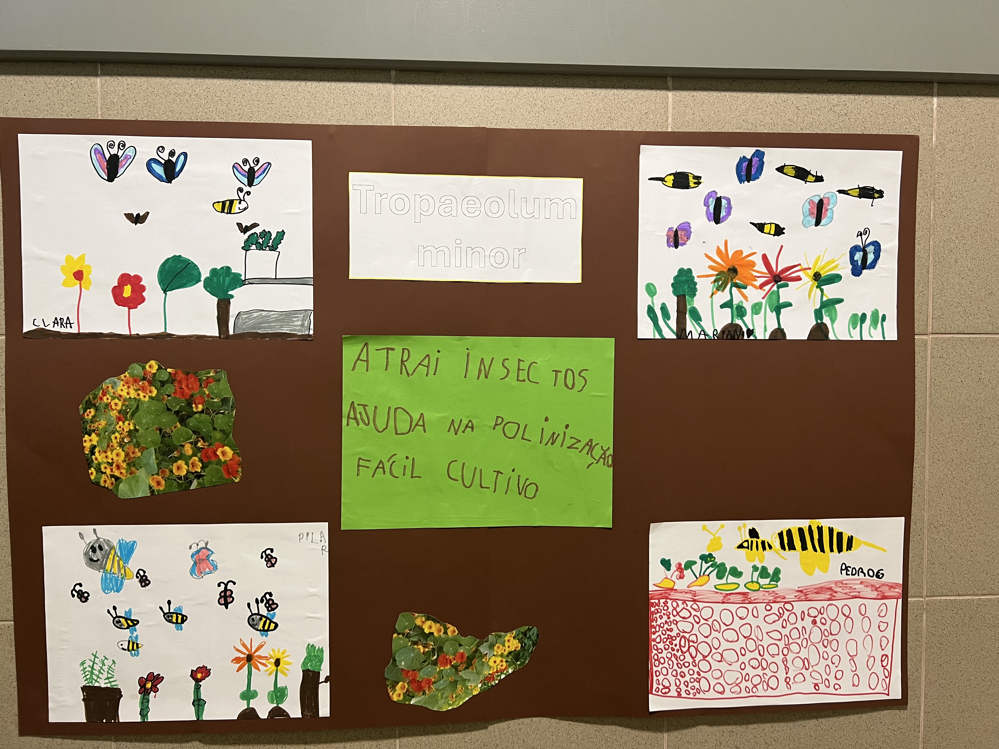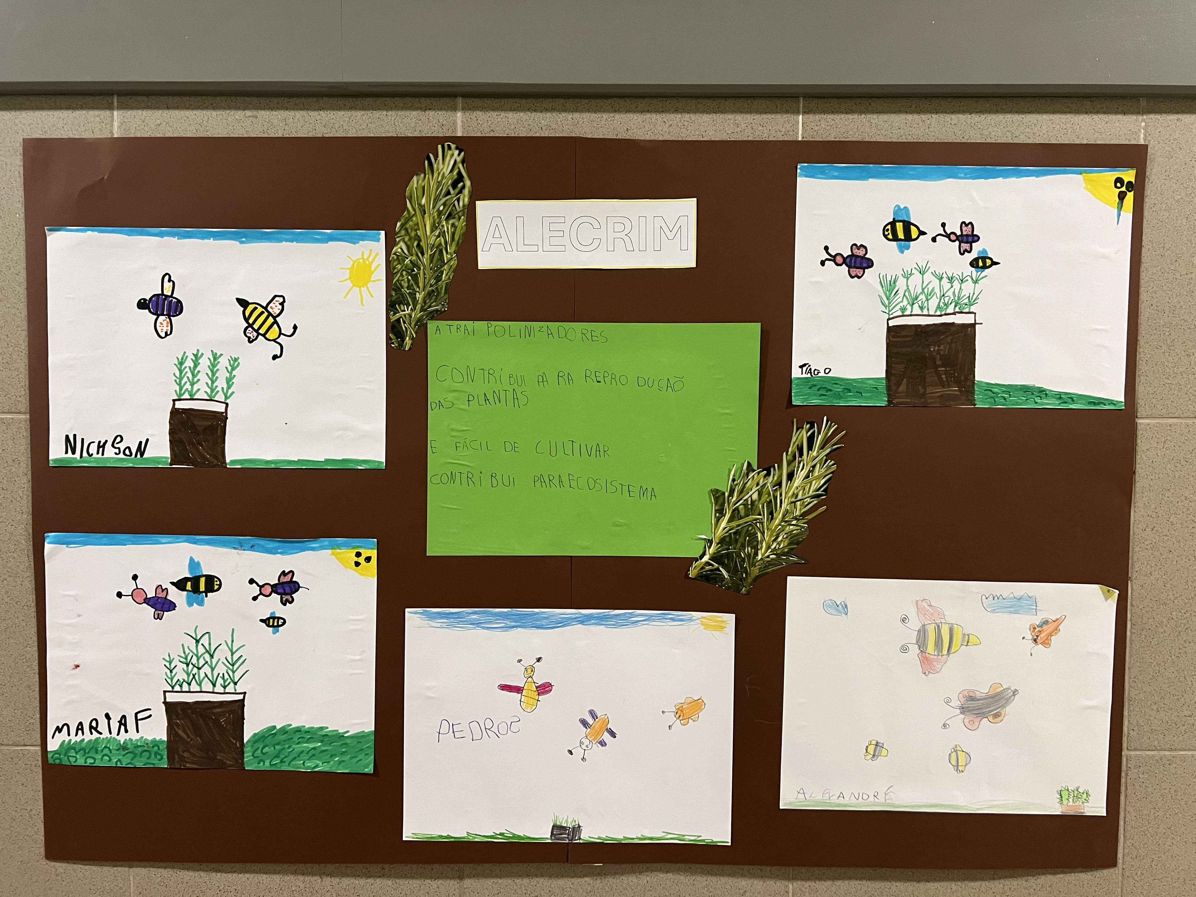 A nossa exposição do jardim dos polinizadores foi criada de uma forma muito criativa e educativa pelos alunos do Pré-Escolar (oficina da Horta). Eles utilizaram folhas e canetas para fazer desenhos representativos das plantas e ervas aromáticas que foram plantadas no jardim. Além disso, fizeram um levantamento dos aspectos mais importantes de cada planta, destacando o que favorece o crescimento da horta.