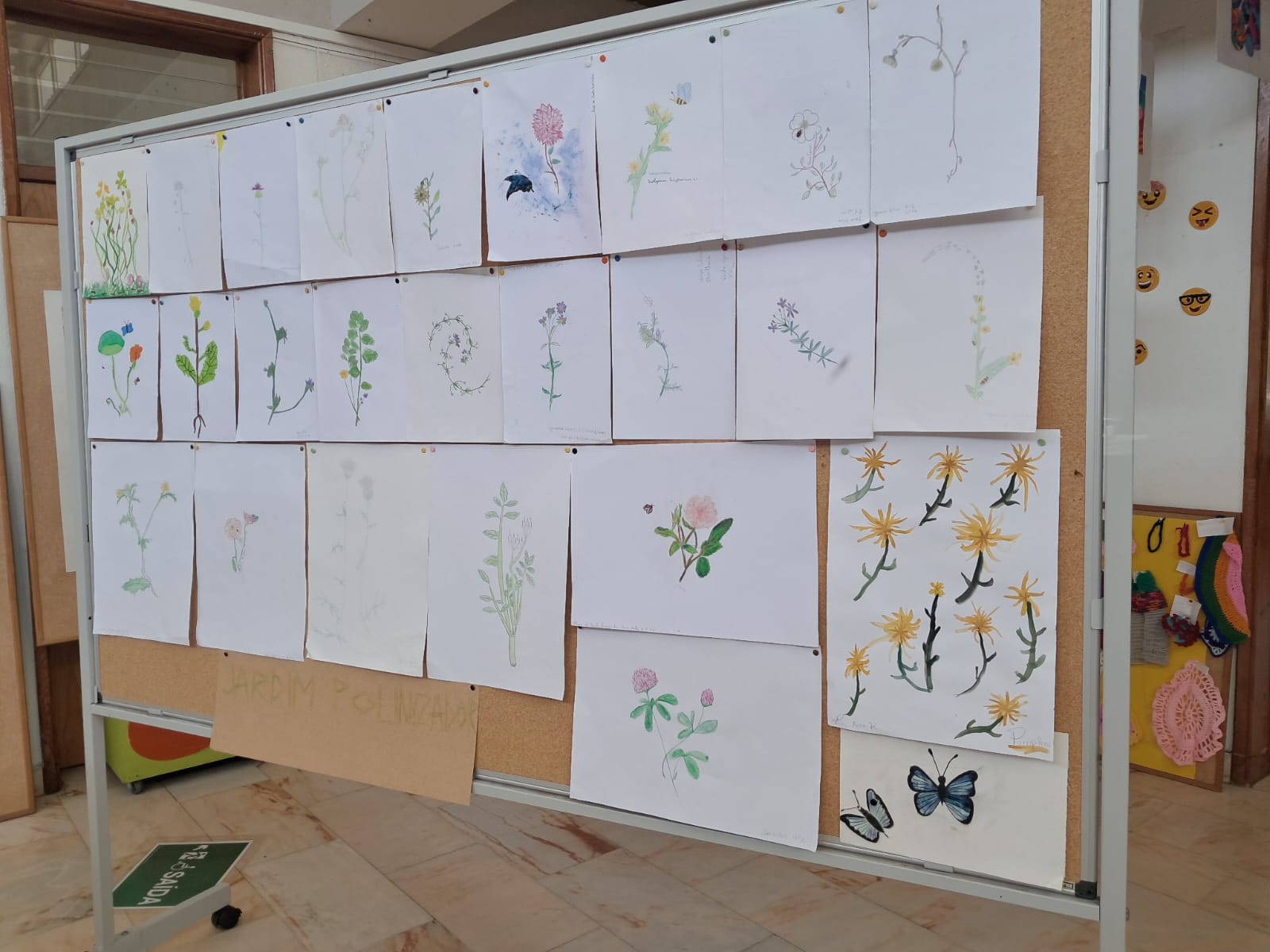 A divulgação do nosso jardim dos polinizadores foi integrada na exposição da Semana das Artes, realizada no átrio da Biblioteca Escolar, local com elevada frequência de passagem da comunidade escolar - alunos, professores, assistentes operacionais, técnicos vários e pais e encarregados de educação, para além de outros. Os alunos envolveram-se com entusiasmo em todo o processo - observaram, cheiraram, sentiram (picos dos cardos e da roseira) e provaram as flores comestíveis. Foi muito animado e com alguma excitação . Resultou nos desenhos de observação da planta com alguma preocupação científica, e representação do inseto observado no jardim. A visita/sessão de exploração com a Fernanda Botelho foi um sucesso, com muita adesão por parte dos alunos e foi fonte de motivação do resto do trabalho realizado.