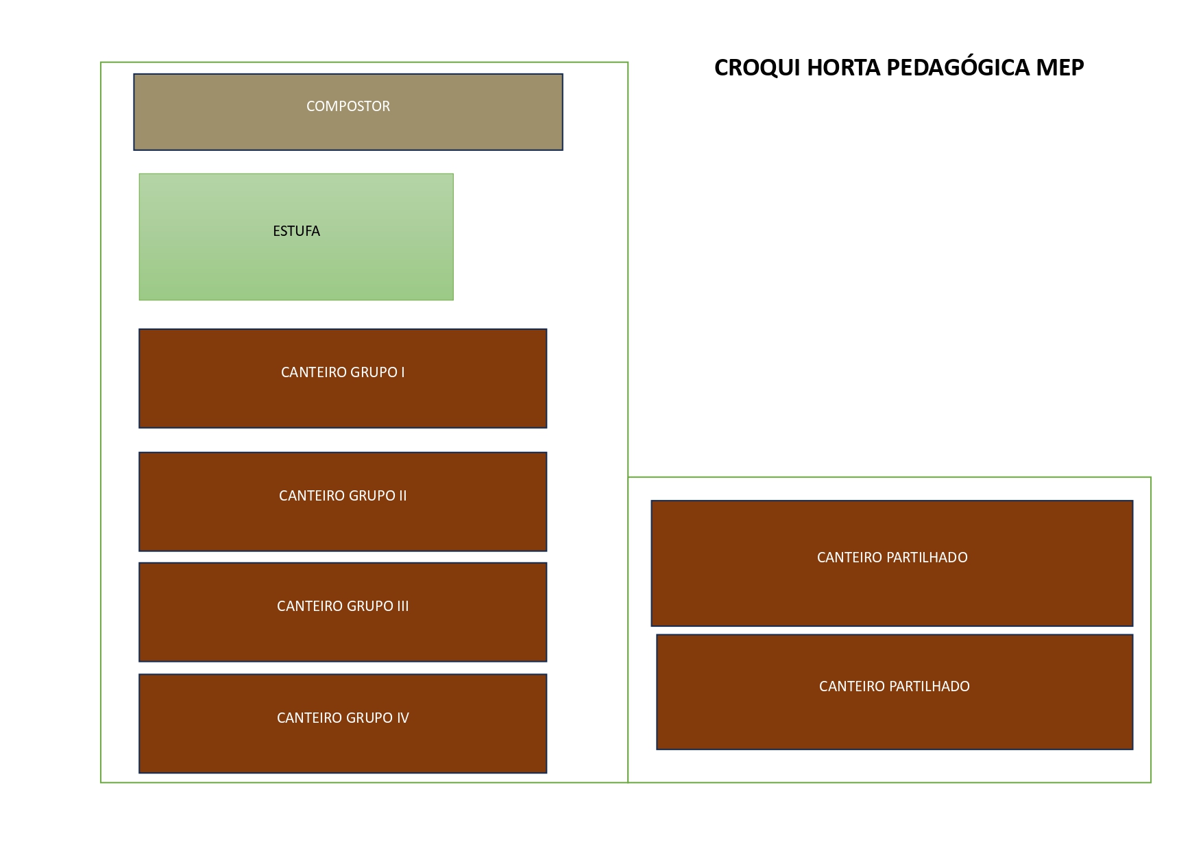 A repartição de tarefas é da responsabilidade da professora, desta forma são organizados grupos de trabalho, cada grupo mantém o seu canteiro e uma vez por semana há um grupo responsável pelo compostor.
