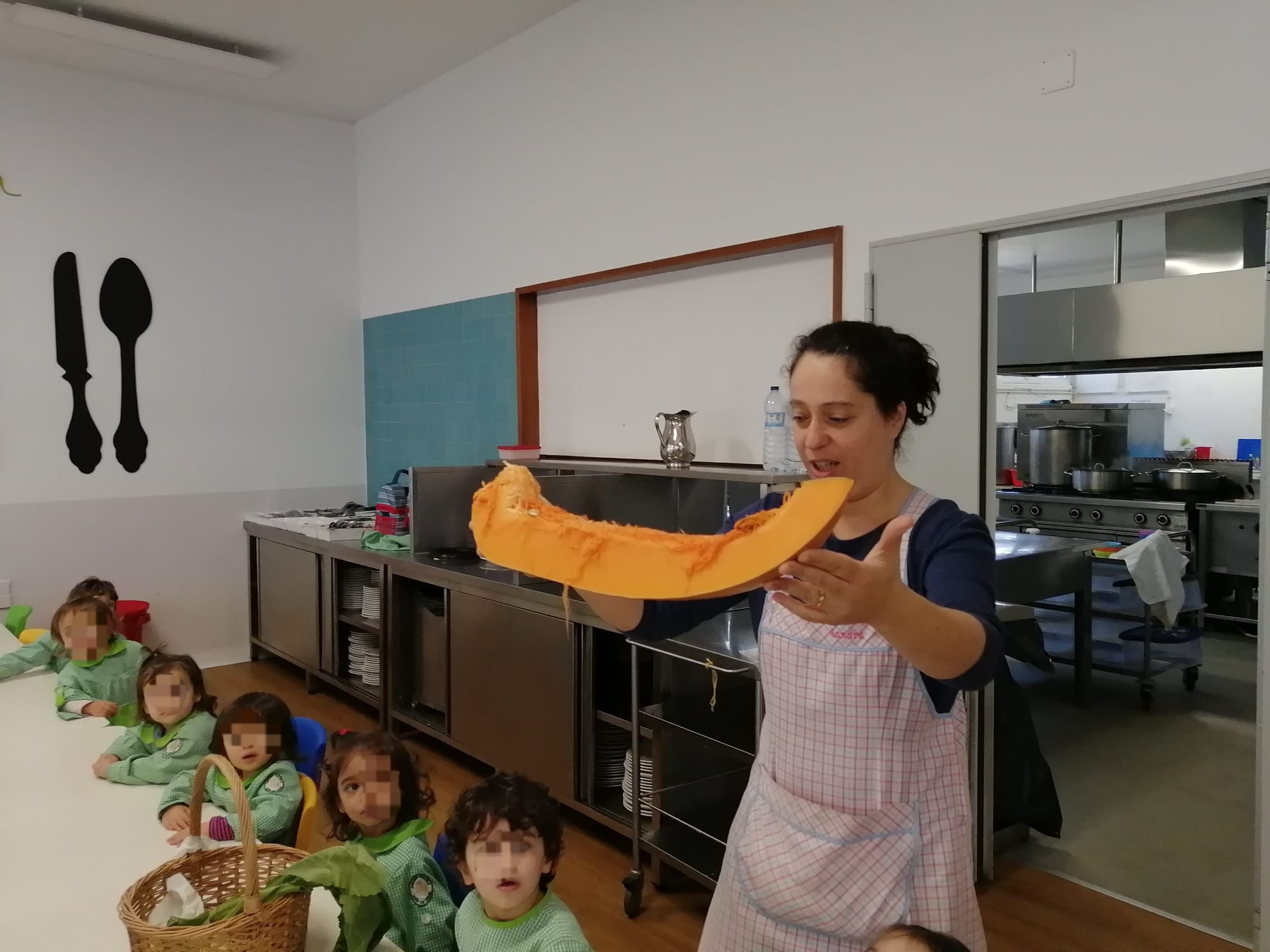 A atividade em si, colher, lavar, tocar, cheirar, nomear, ajudar a cortar , colocar na panela, mexer, colocar os outros ingredientes que não provêm da horta, acompanhar a confeção e por fim comer.