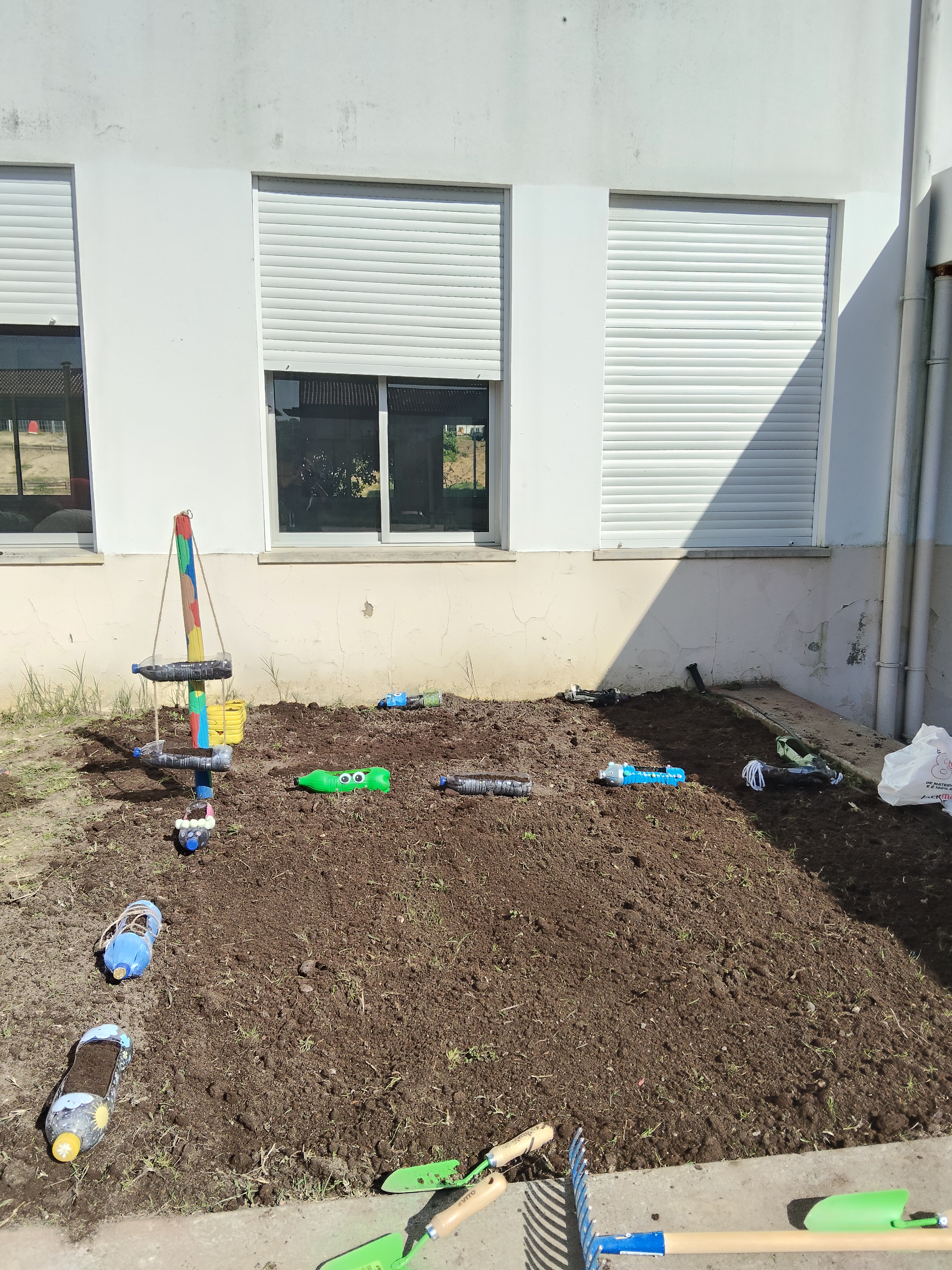 Os alunos de 2º ciclo prepararam, limparam e fertilizaram o terreno. Ajudaram ainda a manter o seu canteiro e os restantes controlados de infestantes. Foi pedido aos alunos de 2º ciclo que fizessem os vasos de separação dos terrenos com materiais reutilizáveis.